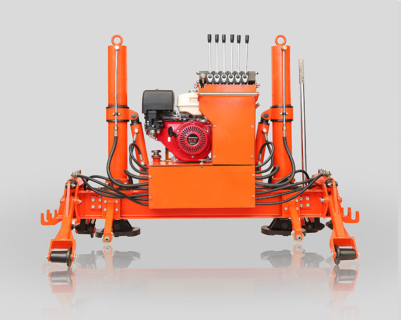 YQB-5.8型液壓起撥道機該機具有起道、撥道功能。其結構簡單輕便、操作靈活、安全可靠,可進行線路的搶修和維修。本機以進口本田汽油機為動力,直接驅動齒輪泵,由多路換向閥控製各工作油缸動作,實現機架就位、勾軌、傾斜、起撥油缸等動作。